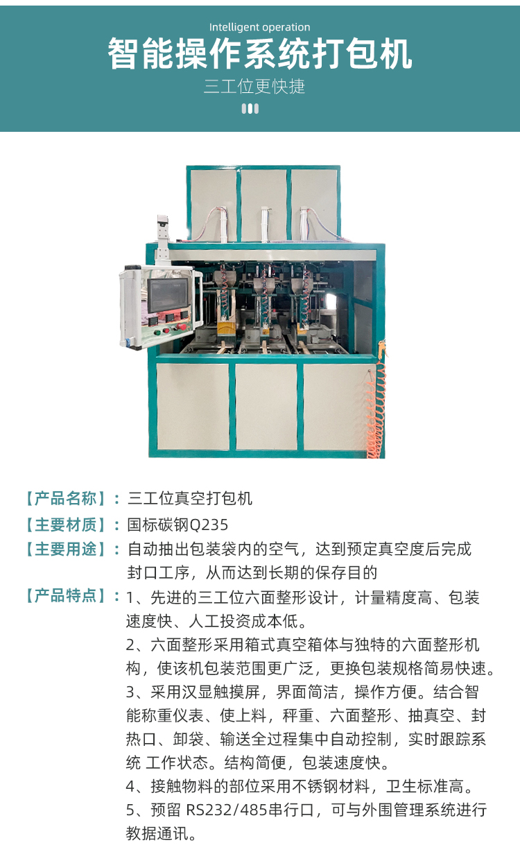 3、采用漢顯觸摸屏,界面簡(jiǎn)潔,操作方便。結(jié)合智能稱(chēng)重儀表、使上料,秤重.六面整形、抽真空、封熱口、卸袋、輸送全過(guò)程集中自動(dòng)控制,實(shí)時(shí)跟蹤系統(tǒng) 工作狀態(tài)。結(jié)構(gòu)簡(jiǎn)便,包裝速度快。